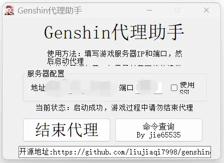 下载Genshin代理助手并输入给出的服务器地址与端口号。点击启动代理。提示启动成功后即可启动原神PC。