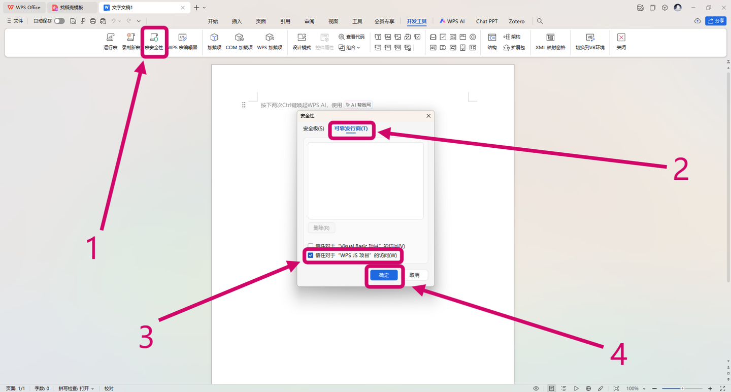 11.点击宏安全性>可靠发行商>信任对于“WPS JS项目”的访问>确定