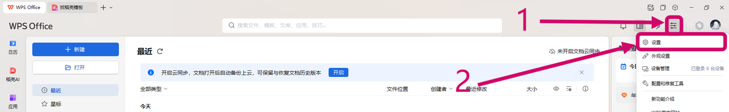6.打开WPS,点击菜单>设置