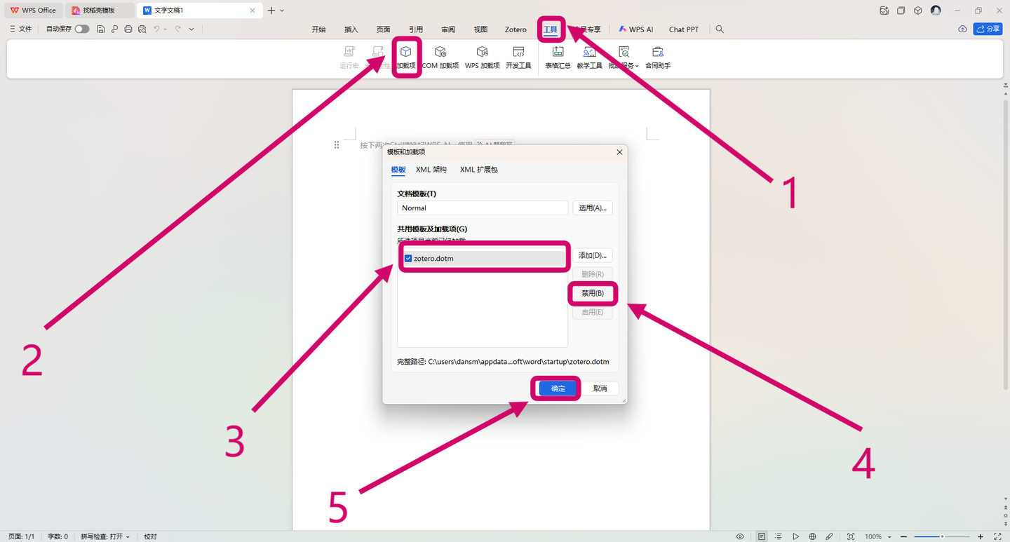 1.到WPS禁用原有Zotero插件:工具>加载项>zotero.dotm>禁用>确定