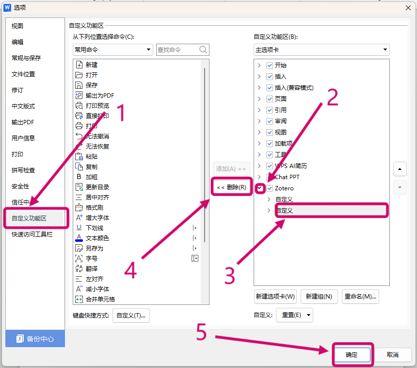 2.依次点击自定义功能区>展开Zotero>选中第二个自定义>点击删除>确定